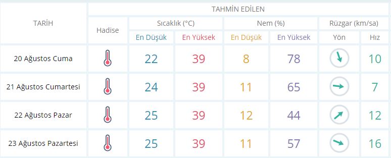 21 Ağustos Cumartesi günü en düşük sıcaklık 24 derece, en yüksek sıcaklık ise 39 derece açık ve sıcak olacak.