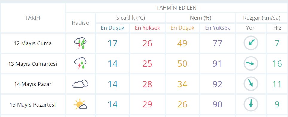 14 Mayıs Pazar günü en düşük sıcaklık 14 derece, en yüksek sıcaklık ise 28 derece bulutlu olacak.