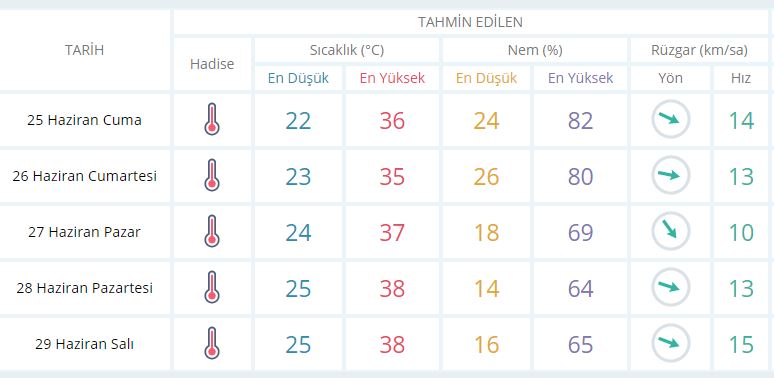 28 Haziran Pazartesi günü en düşük sıcaklık 25 derece, en yüksek sıcaklık ise 38 derece açık ve sıcak olacak.
