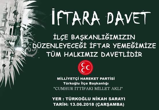 Milliyetçi Hareket Partisi Türkoğlu İlçe Başkanlığı tarafından düzenlenen iftar programına tüm Türkoğlu halkı davetlidir.