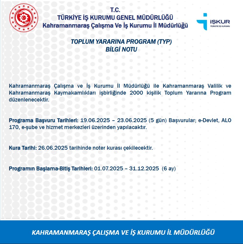Kahramanmaraş Çalışma ve İş Kurumu İl Müdürlüğü ile Kahramanmaraş Valilik ve Kahramanmaraş Kaymakamlıkları işbirliğinde 2000 kişilik Toplum Yararına Program düzenlenecektir.