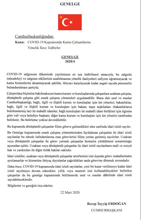 Cumhurbaşkanlığı tarafından yayınlanan genelge ile kamu çalışanları dönüşümlü ve esnek çalışma yöntemi uygulanarak idari izinli sayılacaklar.