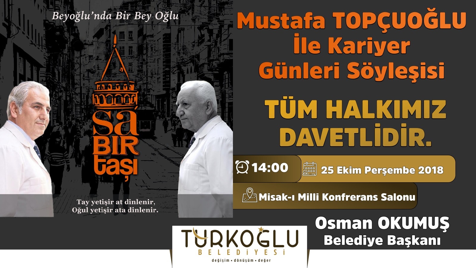Türkoğlu Belediyesi tarafından Türkoğlu’ndan yetişen başarılı insanları Türkoğlulu vatandaşlar ve öğrencilerle buluşturmak amacıyla düzenlenen kariyer günlerine İstanbul’dan bir Türkoğlulu katılıyor. Beyoğlu İstiklal Caddesi üzerinde faaliyet gösteren Sabırtaşı Restoran’ın sahibi ve gönüllü Türkoğlu elçisi olan Mustafa Topçuoğlu Kariyer Günleri Söyleşisine katılacak.
