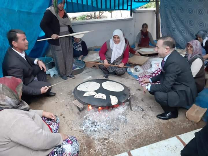 Türkoğlu İlçe Kaymakamı Gürbüz Saltaş ile Belediye başkanı Osman Okumuş ilçede bulunan kırsal mahallelere sık sık inceleme gezisine çıkıyorlar. İlçeye bağlı Uzunsöğüt Mahallesinde yaptıkları ziyarette gözleme yapan kadınları gören Kaymakam ve Belediye başkanı kadınların gözleme pişirdikleri sacın başına oturarak pişirmeye yardım ettiler.
