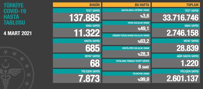 Haftalık verilere göre, bu hafta hastalarda zatürre oranı yüzde 3,6, yatak doluluk oranı yüzde 49,1, erişkin yoğun bakım doluluk oranı yüzde 63,2, ventilatör doluluk oranı yüzde 28,3, ortalama temaslı tespit süresi 8 saat, filyasyon oranı yüzde 99,9 olarak kayda geçti
