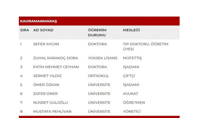Milliyetçi Hareket Partisi bugün sahur vakti milletvekili aday listelerini açıkladı. Açıklanan listeye göre Kahramanmaraş Milletvekili Aday Listesi şu şekilde;
