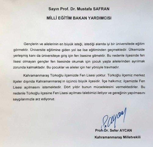 Kahramanmaraş Türkoğlu ilçemizde Fen Lisesi yoktur. Türkoğlu ilçemiz merkez ilçeler dışında Kahramanmaraş’ın üçüncü büyük ilçesidir. İlçe halkımız; ilçemizde Fen Lisesi açılmasını istemektedir. Dört yıldır bunun mücadelesini vermektedirler. Bu nedenle Türkoğlu ilçemizde Fen Lisesi açılma talebimizi iletiyor ve gereğinin yapılmasını saygılarımızla arz ediyoruz. ” ifadelerine yer verdi.