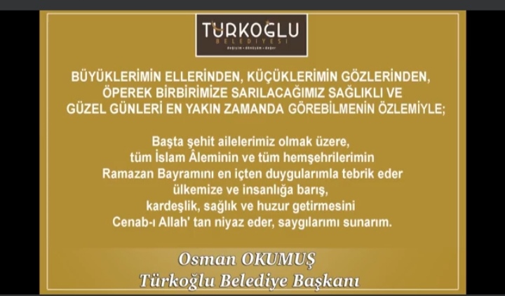 Türkoğlu Belediye başkanı Osman Okumuş hizmetlere, Ramazan Bayramı dolayısıyla mesaj yayınlayarak vatandaşların bayramını kutladı.