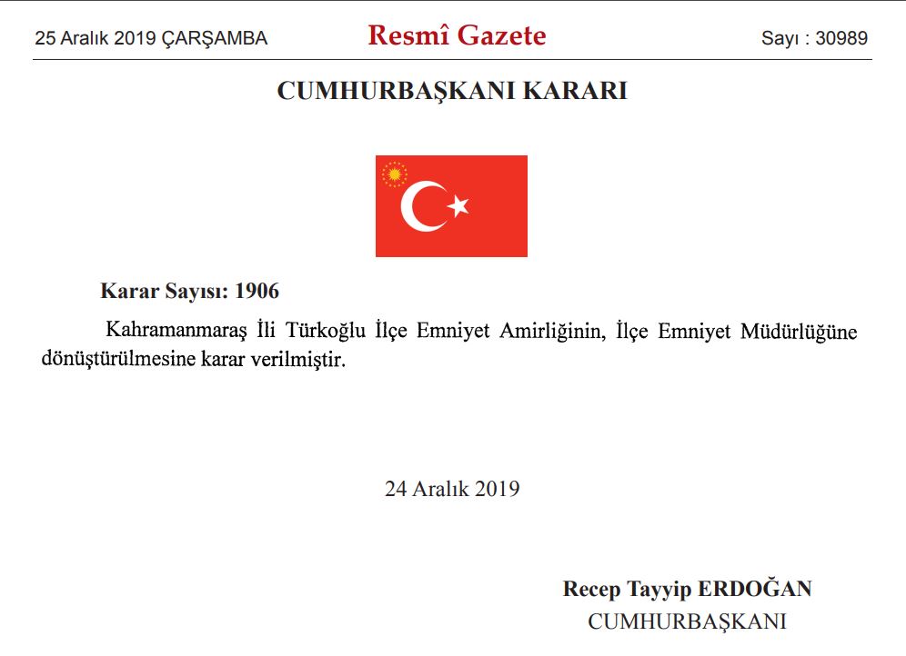 25 Aralık 2019 tarihli (Bugün) ve 30989 sayılı Resmi Gazetede yayınlanan 1906 Sayılı Cumhurbaşkanlığı kararında “Kahramanmaraş ili Türkoğlu İlçe Emniyet Amirliğinin, İlçe Emniyet Müdürlüğüne dönüştürülmesine karar verilmiştir.” ifadelerine yer verildi.
