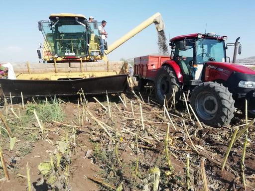 Kahramanmaraş’ın Türkoğlu ilçesinde yaklaşık beş bin dekar alanda çerezlik olarak üretilen ay çiçeğinin hasadı başladı. Zorlu bir süreç olan hasat döneminde ilk olarak ay çiçekleri kesilerek sapı üzerinde kurumaya bırakılıyor. Bir kaç gün kurumasını müteakip biçer döver yardımıyla hasat ediliyor.