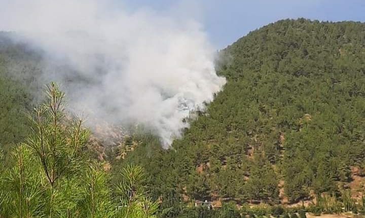 Kahramanmaraş’ın Türkoğlu ilçesinde ormanlık alanda yangın çıkarken, söndürme çalışmaları devam ediyor.