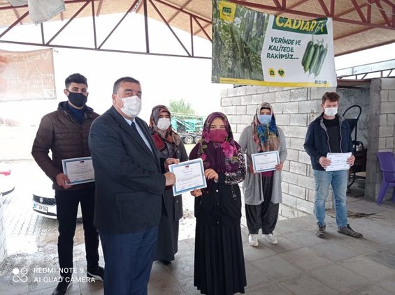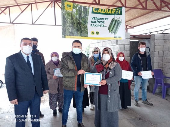 Türkoğlu İlçe Tarım Ve Orman Müdürlüğü,MADAD Fonlu FAO ve ilçe Halk Eğitim merkezi Müdürlüğü işbirliği ile düzenlenen Sosyo-Ekonomik Entegrasyonun Desteklenmesi ve Geçim Sağlama İmkanlarının Yaratılması Aracılığıyla Türkiye’de Geçici Koruma Altındaki Suriyeliler Ev Sahibi Toplulukların Dayanıklılığının Geliştirilmesi Projesi Kursu belge dağıtım töreni Kadıoğluçiftliği mahallemizde düzenlendi.