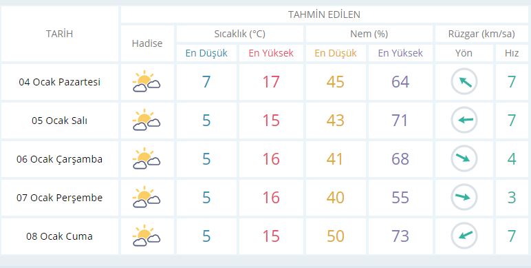 7 Ocak Perşembe günü en düşük sıcaklık 5 derece, en yüksek sıcaklık ise 16 derece parçalı bulutlu olacak.