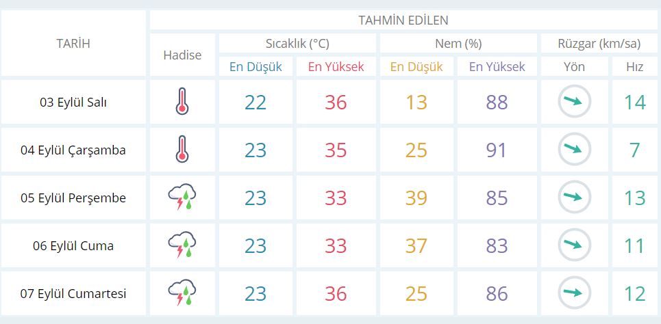6 Eylül Cuma günü en düşük sıcaklık 23 derece, en yüksek sıcaklık ise 36 derece olacak.