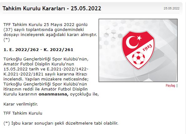 U-18 Türkiye Şampiyonası Finallerinde karşılaştığımız Diyarbakır DSİ. Spor ile normal süresi 0-0 biten maçta, penaltı atışları sonucu 8. Penaltı atışında 6-5 mağlup olmuştuk. Maçta kural hatası yapıldığı için AFDK ya itirazımız olmuş. Sonuç olumsuz olunca TAHKİM e başvurmuştuk. 16.05.2022 tarihli itiraz dilekçemiz 25.05.2022 saat 14:00 da maalesef oy çokluğu ile olumsuz sonuçlanmıştır.