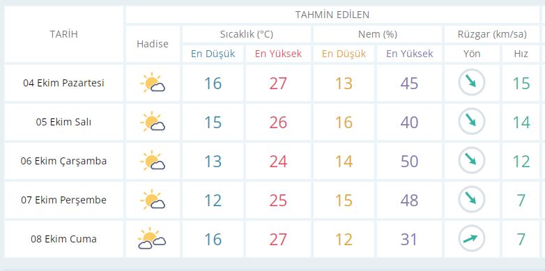 4 Ekim Pazartesi günü en düşük sıcaklık 16 derece, en yüksek sıcaklık ise 27 derece açık az bulutlu olacak.