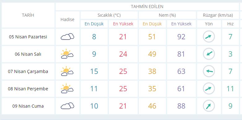 5 Nisan Pazartesi günü en düşük sıcaklık 8 derece, en yüksek sıcaklık ise 21 derece bulutlu olacak.