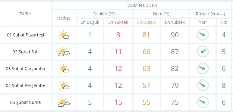 1 Şubat Pazartesi günü en düşük sıcaklık 1 derece, en yüksek sıcaklık ise 8 derece açık az bulutlu olacak.