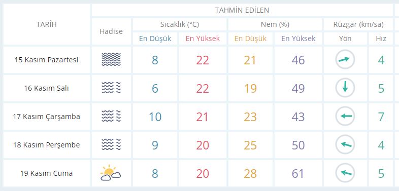 15 Kasım Pazartesi günü en düşük sıcaklık 8 derece, en yüksek sıcaklık ise 22 derece sisli olacak.