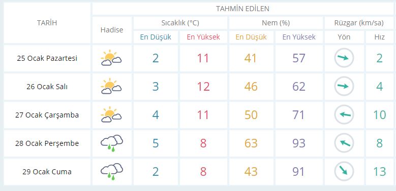 25 Ocak Pazartesi günü en düşük sıcaklık 2 derece, en yüksek sıcaklık ise 11 derece açık az bulutlu olacak.