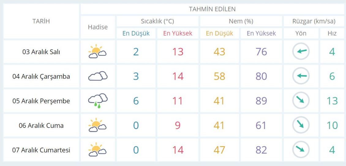 4 Aralık Çarşamba günü en düşük sıcaklık 3 derece, en yüksek sıcaklık ise 14 derece bulutlu olacak.