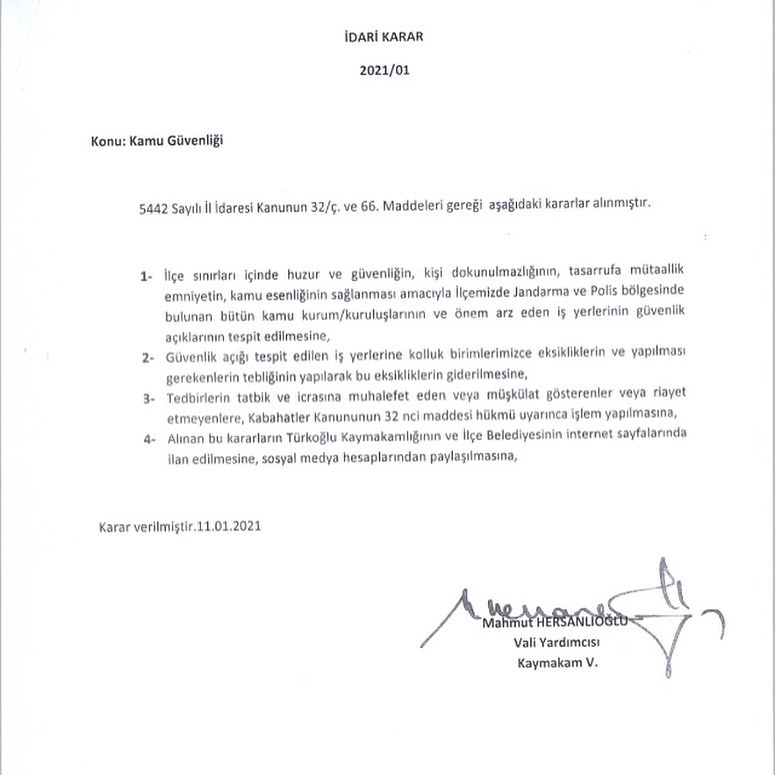 Vali Yardımcısı Kaymakam Vekili Mahmut HERSANLIOĞLU tarafından alınan Kamu Güvenliği (2021/01 Sayılı İdari Karar.)