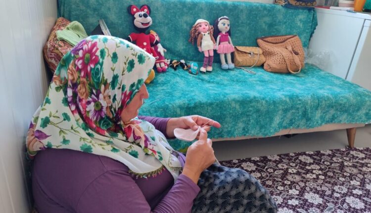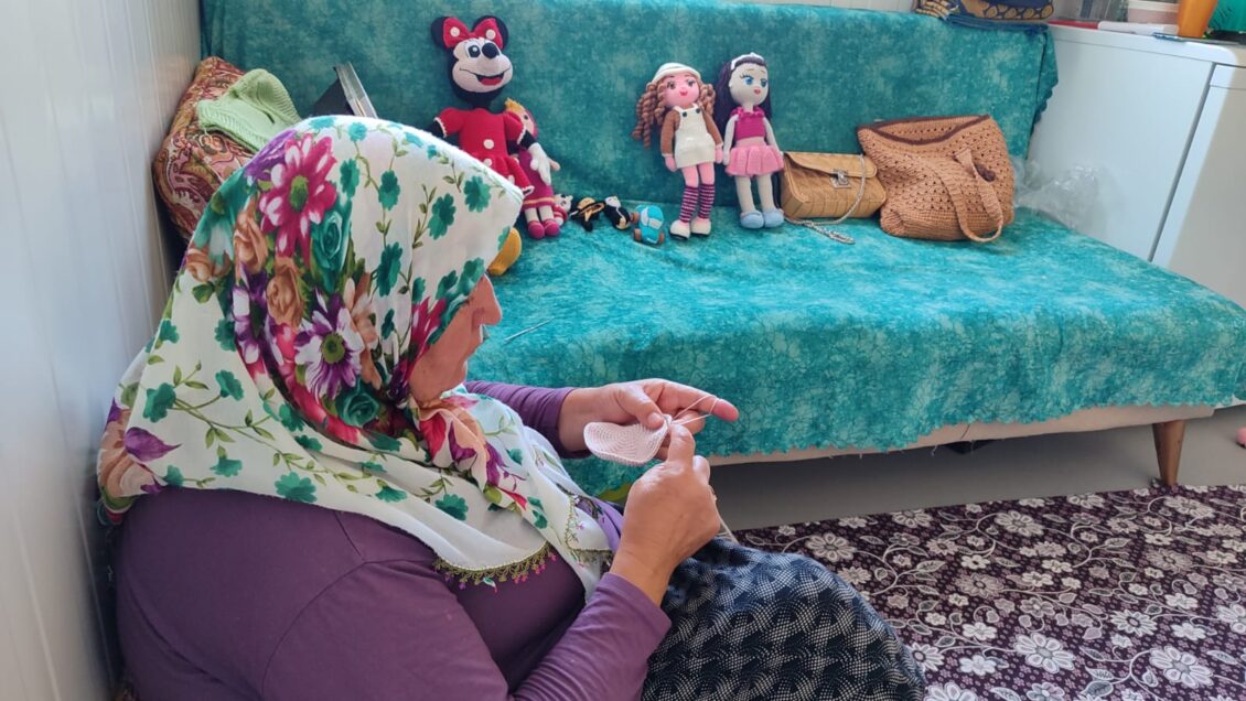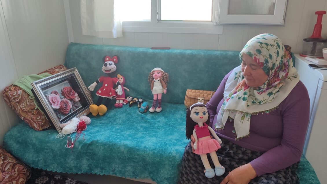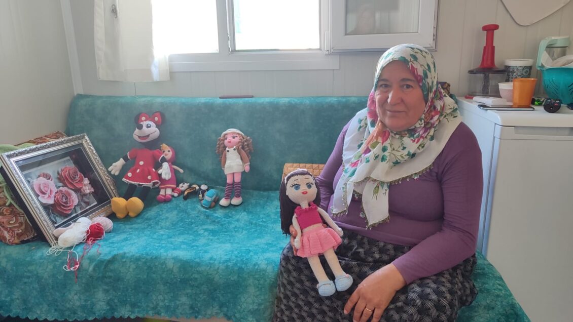 Türkoğlu İlçesi Lojistik Konteyner Kent’te yaşayan 62 yaşındaki 2 çocuk annesi Nurhan Gürdal, bez bebek, çanta ve örgü modelleri yaparak moral buluyor.