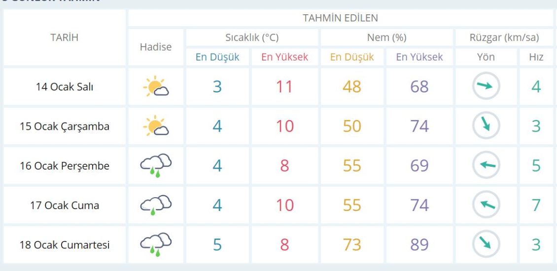 15 Ocak Çarşamba günü en düşük sıcaklık 4 derece, en yüksek sıcaklık ise 10 derece güneşli olacak.