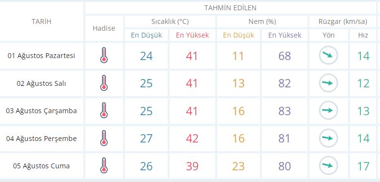 5 Ağustos Cuma günü en düşük sıcaklık 26 derece, en yüksek sıcaklık ise 39 derece açık ve sıcak olacak.