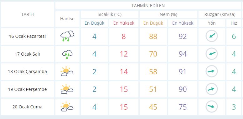 16 Ocak Pazartesi günü en düşük sıcaklık 4 derece, en yüksek sıcaklık ise 8 derece yağmurlu olacak.