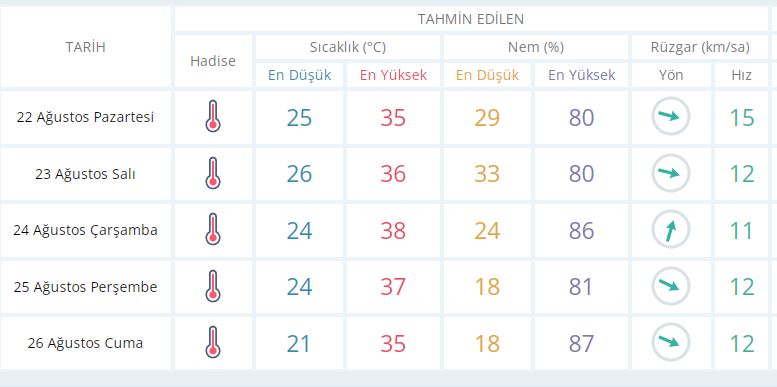 8 Ağustos Pazartesi günü en düşük sıcaklık 25 derece, en yüksek sıcaklık ise 35 derece açık ve sıcak olacak.