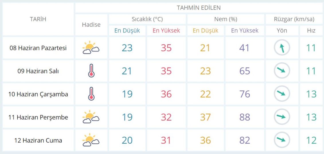 8 Haziran Pazartesi günü en düşük sıcaklık 23 derece, en yüksek sıcaklık ise 35 derece açık az bulutlu olacak.