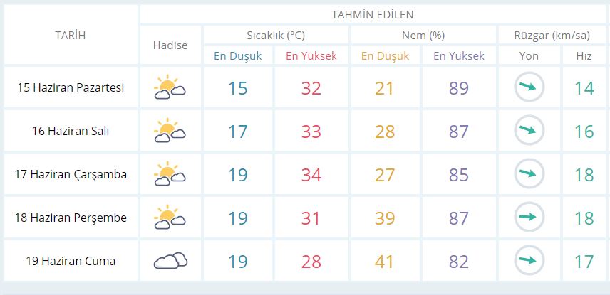 15 Haziran Pazartesi günü en düşük sıcaklık 15 derece, en yüksek sıcaklık ise 32 derece açık az bulutlu olacak.