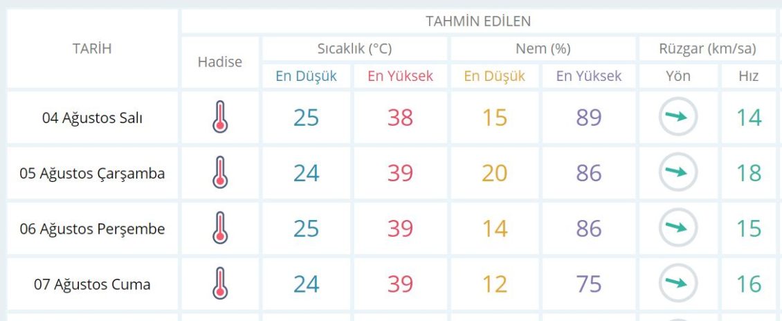 7 Ağustos Cuma günü en düşük sıcaklık 24 derece, en yüksek sıcaklık ise 39 derece sıcak olacak.
