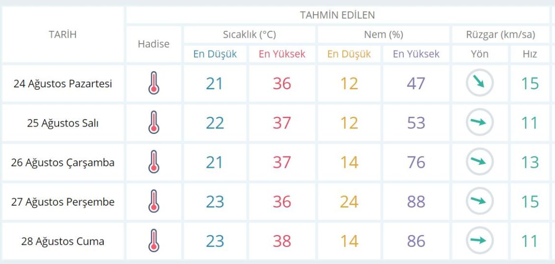 25 Ağustos Salı günü en düşük sıcaklık 22 derece, en yüksek sıcaklık ise 37 derece açık olacak.