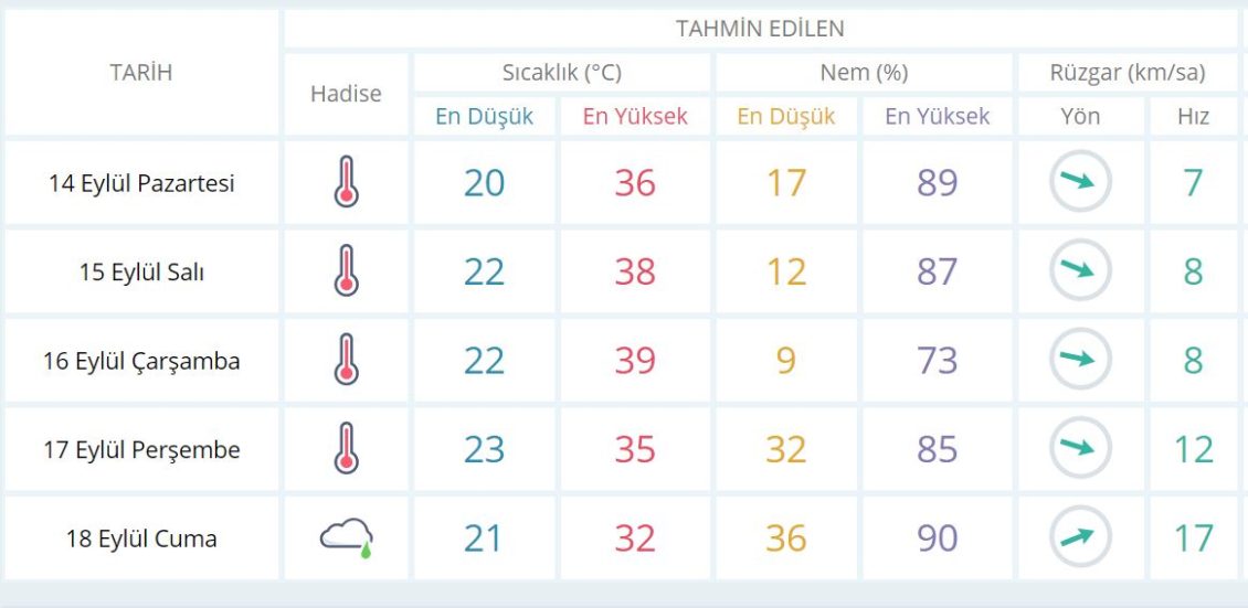 15 Eylül Salı günü en düşük sıcaklık 22 derece, en yüksek sıcaklık ise 38 derece açık olacak.
