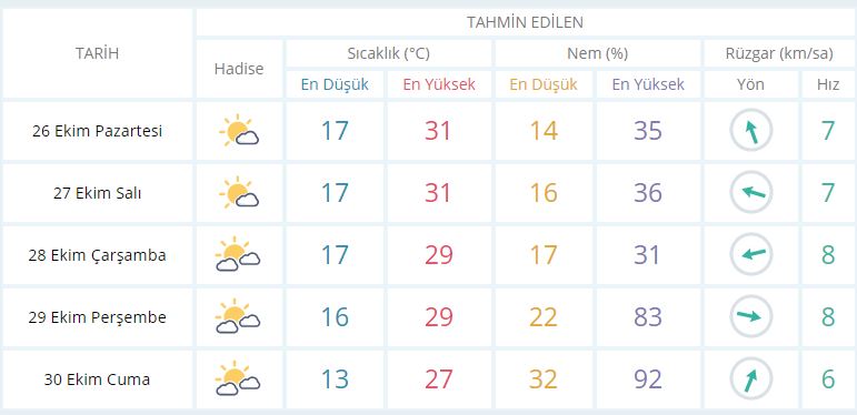 26 Ekim Pazartesi günü en düşük sıcaklık 17 derece, en yüksek sıcaklık ise 31 derece parçalı bulutlu olacak.