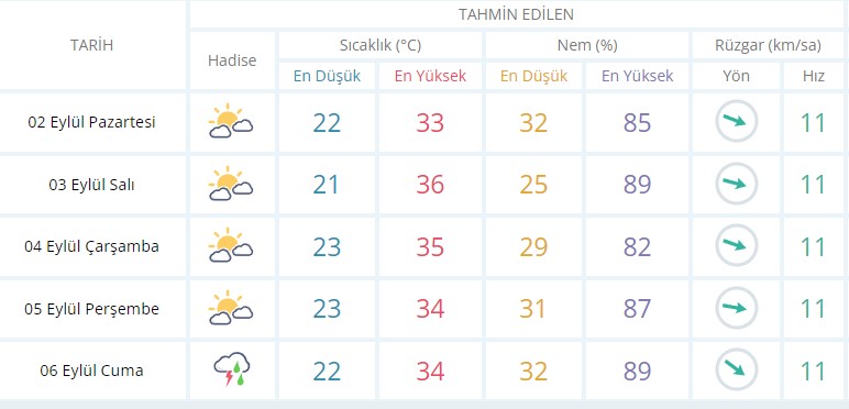 6 Eylül Cuma günü en düşük sıcaklık 22 derece, en yüksek sıcaklık ise 34 derece yağmurlu olacak