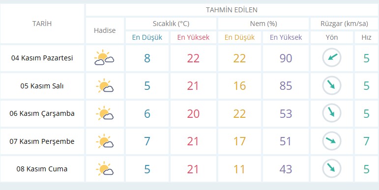5 Kasım Salı günü en düşük sıcaklık 5 derece, en yüksek sıcaklık ise 21 derece açık az bulutlu olacak.