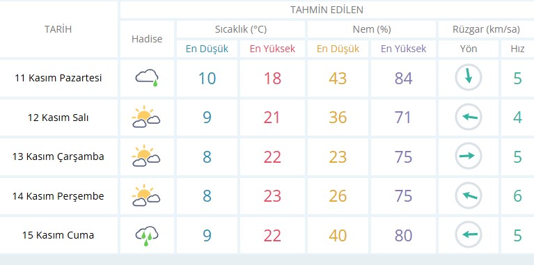 15 Kasım Cuma günü en düşük sıcaklık 9 derece, en yüksek sıcaklık ise 22 derece yağmurlu olacak.