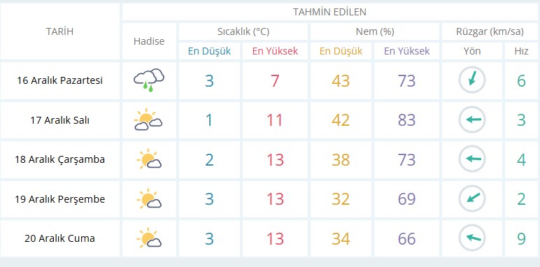 16 Aralık Pazartesi günü en düşük sıcaklık 3 derece, en yüksek sıcaklık ise 7 derece yağmurlu olacak.