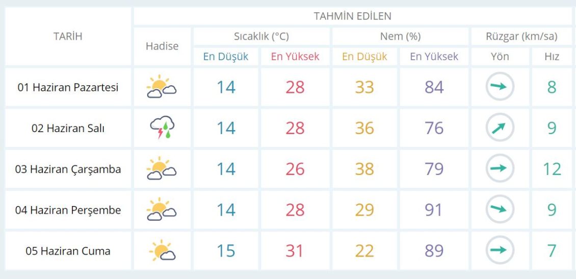 1 Haziran Pazartesi günü en düşük sıcaklık 14 derece, en yüksek sıcaklık ise 26 derece açık az bulutlu olacak.