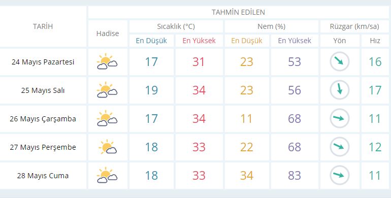 24 Mayıs Pazartesi günü en düşük sıcaklık 17 derece, en yüksek sıcaklık ise 31 derece az bulutlu olacak.