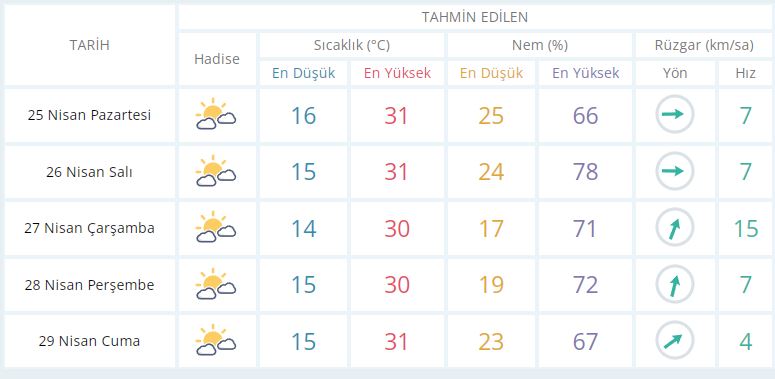 25 Nisan Pazartesi günü en düşük sıcaklık 16 derece, en yüksek sıcaklık ise 31 derece açık az bulutlu olacak.