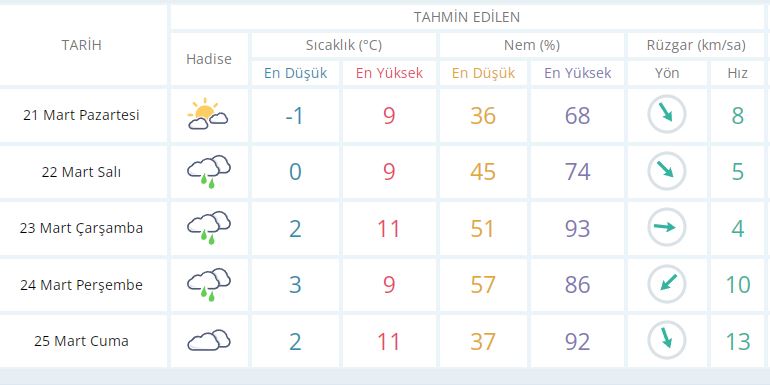 21 Mart Pazartesi günü en düşük sıcaklık -1 derece, en yüksek sıcaklık ise 9 derece parçalı bulutlu olacak.