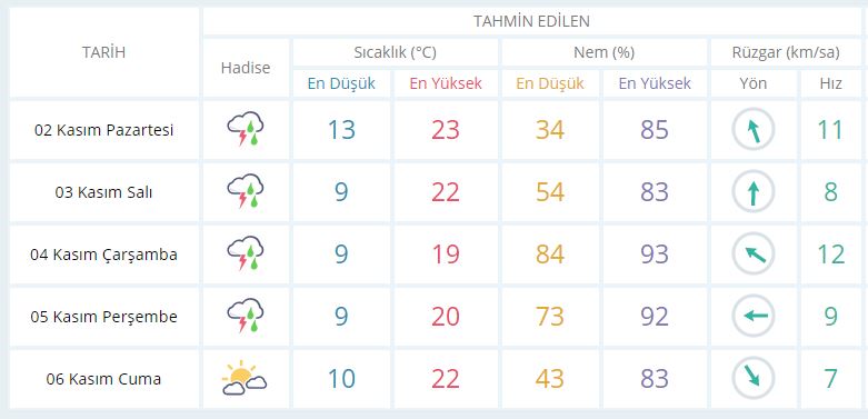 2 Kasım Pazartesi günü en düşük sıcaklık 13 derece, en yüksek sıcaklık ise 23 derece yağışlı olacak.