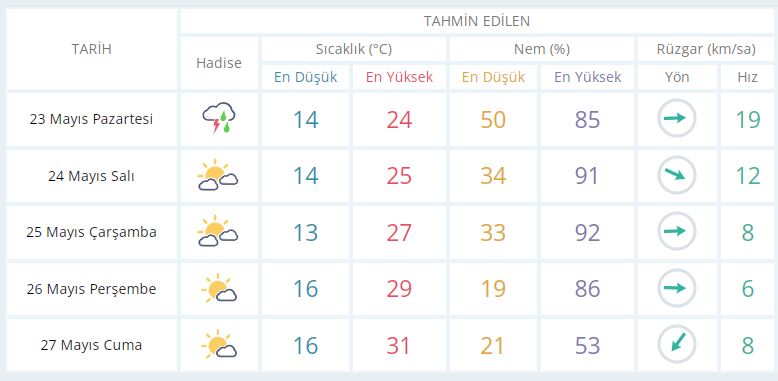 23 Mayıs Pazartesi günü en düşük sıcaklık 14 derece, en yüksek sıcaklık ise 27 derece yağışlı olacak.