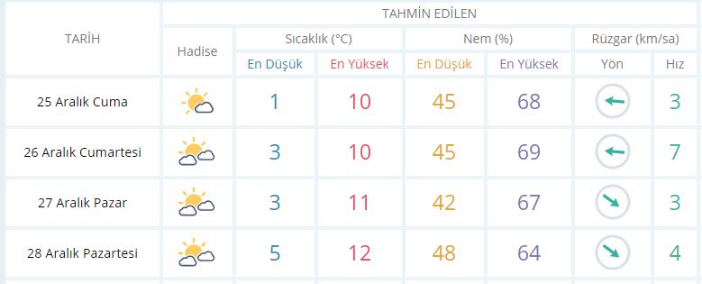 GündemTürkoğlu Haberleri TÜRKOĞLU’NDA BU HAFTA SONU HAVA DURUMU - Editor Tarih 25 Ara, 2020 0 485 Haberi Paylaş Meteoroloji Genel Müdürlüğünden alınan verilere göre hafta sonunda Kahramanmaraş’ın Türkoğlu ilçesinde hafta sonu boyunca hava mevsim normallerinde olacak. Meteoroloji Genel Müdürlüğünden alınan bilgilere göre: 26 Aralık Cumartesi günü en düşük sıcaklık 3 derece, en yüksek sıcaklık ise 10 derece açık az bulutlu olacak. 27 Aralık Pazar günü en düşük sıcaklık 3 derece, en yüksek sıcaklık ise 11 derece bulutlu olacak. 28 Aralık Pazartesi günü en düşük sıcaklık 5 derece, en yüksek sıcaklık ise 12 derece açık az bulutlu olacak. haber türkoğluhafta sonu türkoğlu hava durumukahramanmaraşTürkoğlutürkoğlu hava durumuTürkoğlu hava haftalık hava durumuTürkoğlu hava sıcaklıklarıTürkoğlu ilçesi 0 485 Haberi Paylaş FacebookTwitterGoogle+ReddItWhatsAppPinterestE-posta