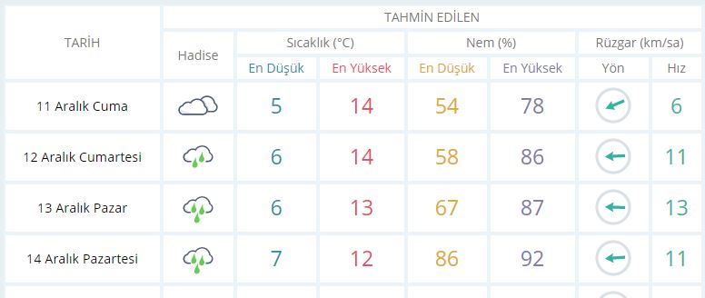 13 Aralık Pazar günü en düşük sıcaklık 6 derece, en yüksek sıcaklık ise 13 derece bulutlu olacak.