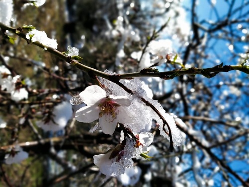 Sabah kalktıklarında badem çiçeklerinin kar altında kaldığını gören vatandaşlar şaşkınlıklarını gizleyemezken don sebebiyle ürünlerde rekolte kaybının oluşmasından endişe ediliyor.